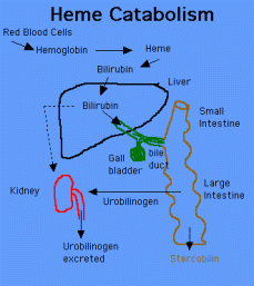 RBCs, that impart red color to our blood have a lifespan of about 120 days. Bilirubin is a brownish-yellow substance produced when the liver breaks down old/defective red blood cells as part of the RBC’s natural life-cycle (New red blood cells are made all the time to replace the ones being broken down). It is metabolized in the liver as a result of regular hemolysis and is typically removed from the body in stools (90%), giving feces its brownish color. A small portion (10%) is removed in urine too, imparting it a pale yellow color.