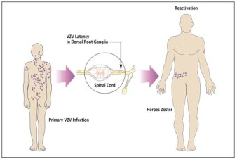 Varicella and herpes zoster are manifestations of the same virus i.e. varicella virus. When a person comes in contact with the Varicella-Zoster Virus for the first time, he develops chickenpox. Even when he recovers, the virus remains latent in the nerves for years. In 15-20% of them, the virus is able to spread albeit locally along the nerve root causing herpes zoster. This occurs due to natural fading of immunity and hence occurs after the age of 40-50 years.